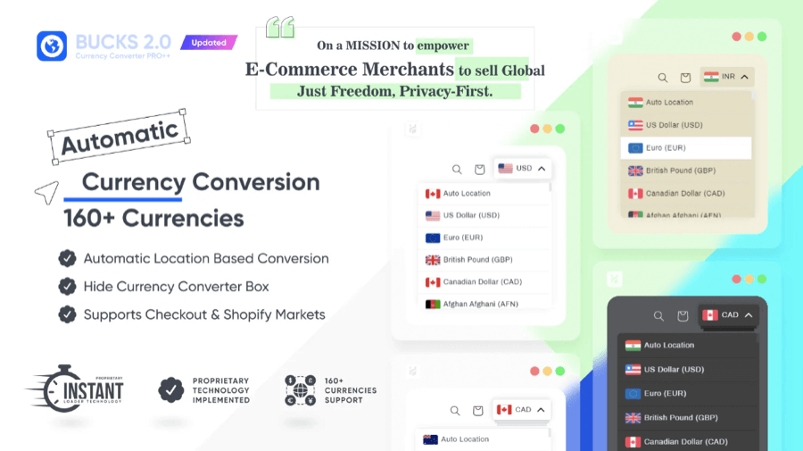 - Instantly convert prices to 160+ currencies based on geolocation data.
